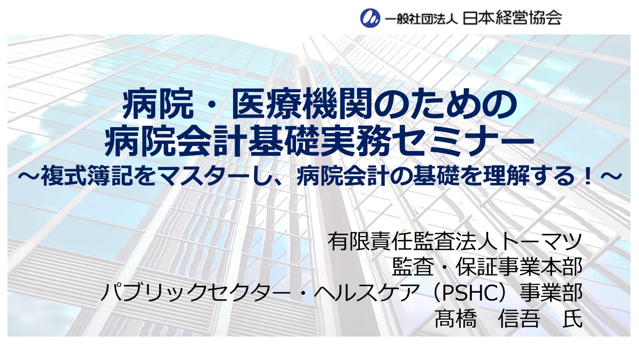 本講座では、病院の経理担当者が必要とする基本的な複式簿記の知識に加え、病院会計に特有の会計事項を身に着けていただくことを目的としております。また、実務に即した会計基礎や日常業務、決算業務を演習も交えながら学びます。新任や経験の浅い経理担当者の方々にもおすすめの講座です。