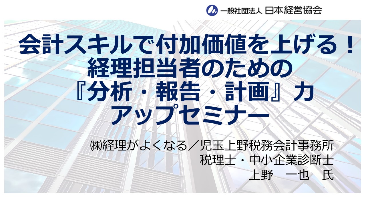 ① いま、経理に求められる会計スキル(会計の専門家としての見方や意見/わかりやすい報告とフィードバック/予算編成のサポート・利益予測等)を踏まえ、講義します。