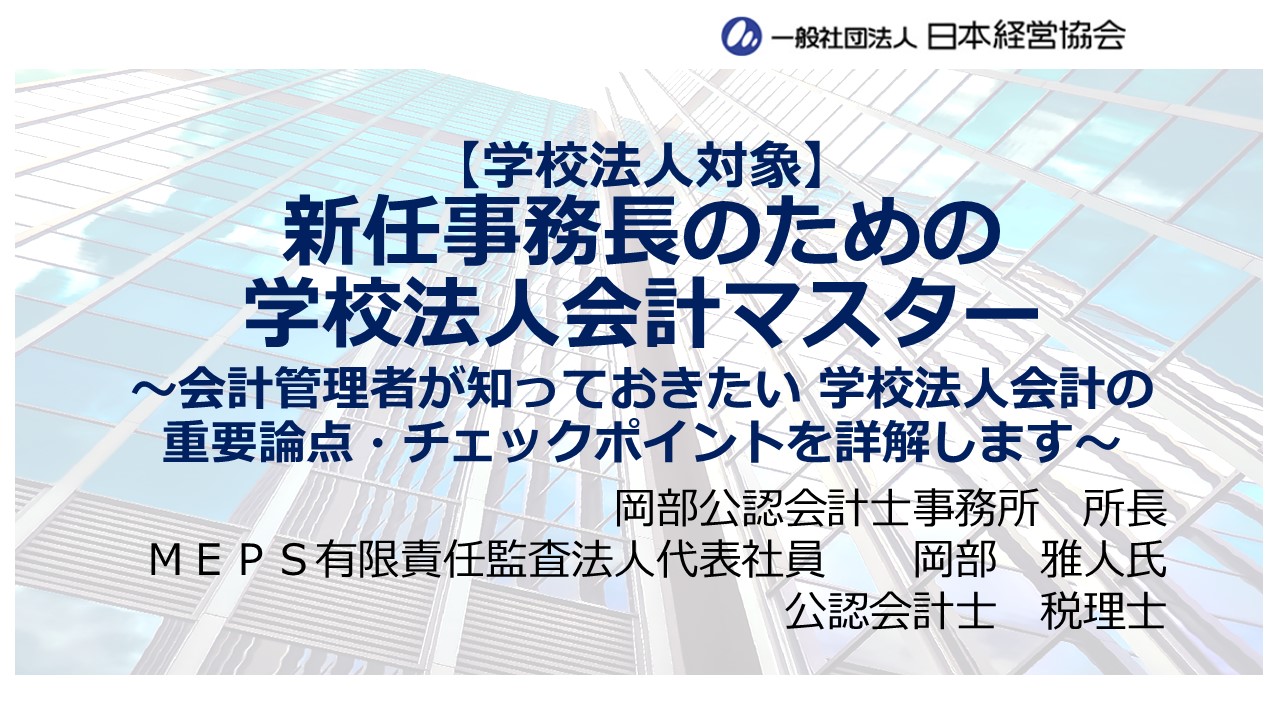 新たに学校法人の事務長、財務部長等に就任したが、これまで学校法人の会計実務に携わっていない方、企業会計は知っているが学校法人会計は初めてという方を対象に、管理職として知っておかなければならない学校法人会計の重要論点、チェックポイント、事業活動収支と資金収支の相違点など、日常業務、決算準備処理実務などについて事例・仕訳を踏まえて管理のポイントについて解説いたします。また、令和7年度から改正された会計基準のポイントについても随時コメントします。