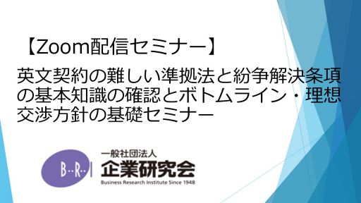 英文契約の難しい準拠法と紛争解決(裁判管轄・仲裁・調停)条項の基本知識の確認とボトムライン・理想交渉方針の基礎セミナー [Legal Technologyの適切な利用のための必須基礎知識を伝授]