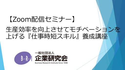 【開催にあたって】 政府の提唱する働き方改革により、各企業とも労働時間の削減が大きなテーマになっています。しかし、労働時間を画一的に短くするというかつての“時短”ではなく、重要なのは、業務プロセスの効率化と社員のモチベーションを両立させ、単位時間の生産効率を高めていくことです。 本セミナーでは、「仕事のスピードアップによる生産効率の向上」に主眼を置き、具体的・実践的な手法を講師の体験を交えながら解説します。