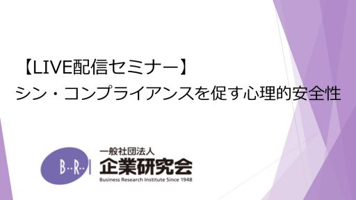 【開催にあたって】 フジテレビ事件など後を絶たない不祥事の主因は、①誤った正当化(歪んだ「正しさ」)を許してしまう②昭和的・閉鎖的・硬直的で消極的な風土です。 つまり心理的安全性がない状態です。そのため、不祥事防止のためには、①「正しさ」が歪む構造を分析し、②心理的安全性を高めて積極的なカルチャーを創る必要があります。 そこで、アドラー心理学を学びコーチング資格を持つ講師が、長年の企業研修の経験を活かして実務的な「心理的安全性の上げ方」を具体的にアドバイスします。 社員の倫理観を高めたい経営層や、コンプライアンスの浸透に悩む管理・法務・コンプライアンス部門の方にお勧めのセミナーです。