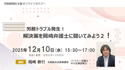 【開催にあたって】 いわゆる問題社員や職場のトラブルは、1人でも従業員がいれば起こりうる問題であり、企業規模を問わず経営者・人事部門を悩ます問題です。 一言で「問題社員」と言った場合でも、勤怠不良の従業員の場合もあれば、職場内で不適切な言動を繰り返す従業員の場合や情報漏洩等を行っている従業員の場合等、様々な場面が想定され、それぞれに応じて対応の選択肢は変わってきます。 また、そのような問題行動を行う動機として、会社に不満があるのか、会社に不満はないものの本人の性格によるものか、もしくは本人には悪気がなく正義感に基づいて行っているのか等様々な動機があり、こうした「その問題社員」の特徴も検討したうえで、どのような対応をとるかを判断することも重要になります。 もちろん、「解雇をした場合に有効となるか」という点や、解雇をしないとした場合、法的にどのような措置を講じることができるのかという点も考えなければなりません。 このように、問題社員、職場トラブルにあたっては、解雇の有効性を中心とした法的な論点の検討に加え、実務的な経験を踏まえた現実的な考慮要素も併せ検討し、対応方法を決めていく必要があります。 本講では、問題社員対応の経験豊富な弁護士が、法的観点も含め様々な問題社員の類型に応じた選択肢と対応方針の決定のポイントを解説します。