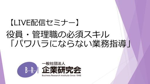 【開催にあたって】 経営者・管理職がパワハラの加害者と認定されると、本人、会社、被害者および職場環境等に様々なリスクが生じます。被害者との隔離措置として、加害者の異動が求められれば、中小企業には死活問題になることもあります。しかし、業務指導は役員・管理職の職責であり、パワハラとされる可能性があることを理由に業務指導を避けることは許されません(セクハラとの大きな違い)。 現代の役員・管理職に必然的に要求される「パワハラにならない業務指導」について、もう知りませんでしたが通用しなくなっている現状も踏まえ、具体例を挙げて解説します。 ※お席に限りがございますが、本セミナーの進行の性質上、「会場参加」をお勧め致します。