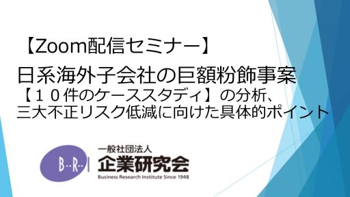 【開催にあたって】 連結決算における海外子会社の重要性が高まる中、傘下の海外子会社で不正が発生した場合、その影響はグループ全体に及び、企業イメージの失墜のみならず、親会社の上場維持に関わる問題にまで発展するリスクがあります。こうした事態を避けるためには、発生し得る不正のパターンと根本原因を十分に理解した上で、本社による子会社の適切な財務諸表分析や、モニタリング、海外往査が重要になります。 本セミナーでは、2010年代に発生した大型の日系海外子会社の「会計不正(粉飾)」代表的10事例を類型化し、不正のスキーム、発生を許した要因、発覚の経緯、財務上の不正の兆候を明らかにします。その上で、事例を通して予防と早期発見に向けた具体的ポイントを解説します。併せて、海外子会社における資産横領、不正流用、汚職(贈収賄)についても、その予防と早期発見のための具体的ポイントを解説します。