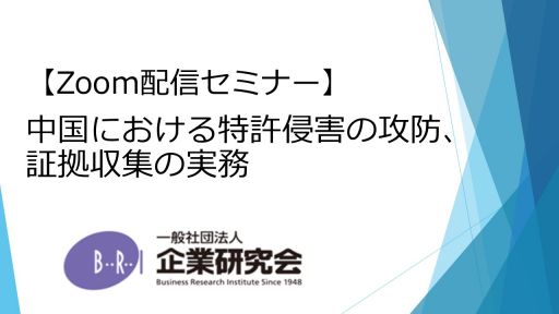 【開催にあたって】 本セミナーでは、調査会社において多数のイ号製品や関連証拠収集の実績を、弁護士として多数の中国特許権侵害訴訟、審判、行政摘発に関与した実績を有する講師により、単なる法律論だけでなく、現場の実務に基づく具体的な対応方策案を紹介します。 中国と日本とでは訴訟実務やベースとなる経験則、文化等に大きな違いがあり、最善の結果を得るためには中国の実態にあわせた戦略が必要不可欠です。 本セミナーでは、中国特許に関して攻撃側・防御側で最善の結果を得る必要十分な備えができることを目的とします。