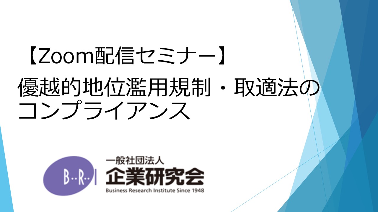 【開催にあたって】 近時の原料価格の高騰や労務費の上昇を受けて、内閣官房を中心に令和3年12月「パートナーシップによる価値創造のための転嫁円滑化施策パッケージ」が取りまとめられ、そのなかでも独禁法上の優越的地位の濫用規制や中小受託取引適正化法(取適法)の運用を強化していくことが明記されています。公正取引委員会は価格転嫁に関する調査を行い令和4年12月27日、令和6年3月15日、令和7年3月4日に、価格交渉等への対応や価格転嫁が不十分とされた発注側の企業について、社名を公表しています。 優越的地位の濫用に関しては、違反事件への調査が活発化しており、行政処分に至る例も再び出てきています。 令和8年1月1日から施行されている中小受託取引適正化法(取適法)は、各種の規制強化がなされており、対応が漏れている部分がないか確認が必要です。違反事例への指導件数も減ることはなく、有名企業による大規模な違反事例が勧告の対象となり大きく報道される等、今後も引き続き積極的な法執行がなされることが見込まれます。 本セミナーでは、公正取引委員会での勤務経験を有する講師が、これらの規制の近時の動向を踏まえて、違反の未然予防や調査対応において、企業において特に留意を要する点について解説します。