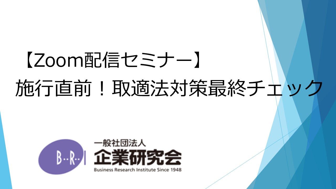 【開催にあたって】  2026年1月1日より下請法の改正法である「製造委託等に係る中小受託事業者に対する代金の支払の遅延等の防止に関する法律」(以下「取適法」といいます。)が施行されます。公正取引委員会からは運用基準の公表もなされ、取適法対策は待ったなしの状況です。  取適法では、従業員基準や特定運送委託という新たな委託類型の追加等が実施され、より中小受託事業者(従前の下請事業者)の保護を図った内容とされています。  しかし、取適法は従前の下請法の内容を引き継いだ部分も多く、今までどおりの下請法対策がそのまま活用できることも多いです。  本講演では、まず、取適法の施行に伴い何が変わるのか、その変化に伴い企業の皆様において必要とされる対策は何かにつきご説明します。  次に、取適法の施行後も引き続き下請法施行時と同様にご留意いただくべきことをご説明し、取適法対策に万全を期すことができる内容とします。  この講演で取適法施行前の最終チェックを行い、最後の詰めを行っていただければ幸いです。