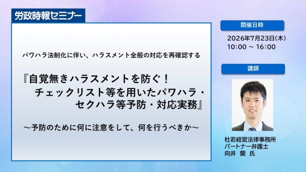 パワハラを防ぐ措置を企業に義務づける法律が施行され、大企業の場合2020年6月1日から、中小企業の場合は2022年3月31日までの努力義務期間を設けたうえで、2022年4月1日からパワハラ防止法を施行します。パワハラは社員の人材流出や仕事への意欲低下につながるため、各企業は対応を急いでいます。しかし、各種報道も教育研修教材も「これを言ってはいけません」「このような指導はパワハラです」と述べるのみで、自覚無きパワハラを防ぐ方法を述べたものではありません。本講座では、パワハラが起きる背景、加害者の置かれている状況からパワハラチェックリスト等を用いてパワハラ予防・解決のポイントを解説します。同様にセクハラ・マタハラについても加害者類型別に予防・解決のポイントをわかりやすく、説明します。是非ご参加ください。