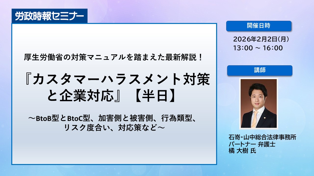 本講座では、改正法の解説をはじめ、裁判例の動向、東京都のカスハラ防止条例、厚労省の企業対策マニュアルなどを紹介しながら、企業が対応すべき実務ポイントをもれなく解説します。