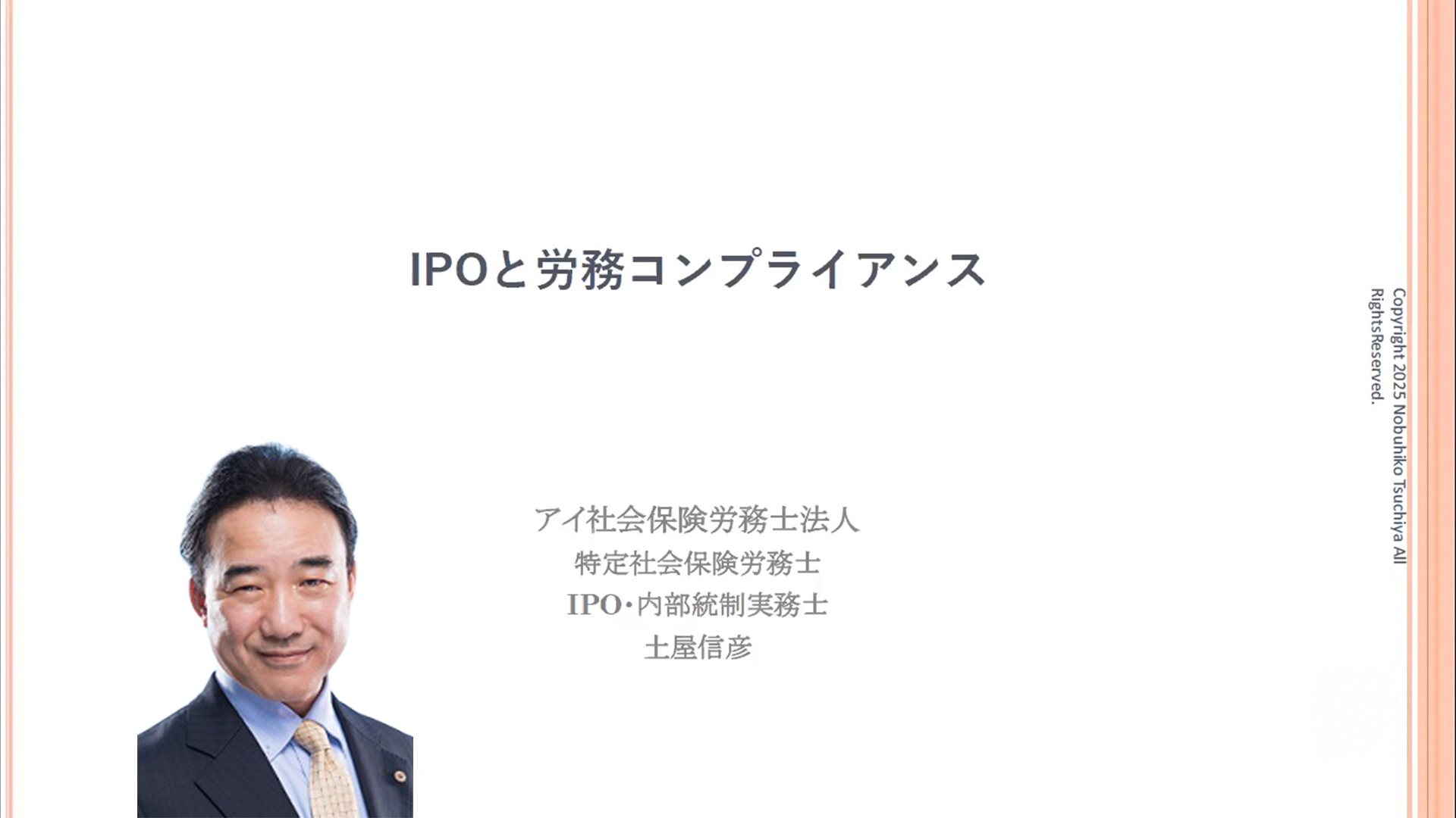 そこで、本セミナーでは特に重要度の高い労務の論点について、わかりやすく解説しています講師の土屋信彦社労士は、IPO内部統制実務士の資格を保有しており、IPOセミナーで多数の実績があり好評を得ています。