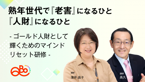 生涯現役という言葉がよく聞かれますが、役職定年、定年退職&継続雇用を経たあともイキイキと働いているひとにはどんな秘訣があるのでしょうか。 もし、「しかたなく働き続ける」「最低限をこなすだけ」といった受動的な働き方になれば、会社にぶらさがる「人罪(じんざい)」となり、周囲のモチベーションも下げる「老害」になる危険性があると言えるでしょう。 特に、昭和の人生観を引きずって仕事を頑張ってきた今の50歳代後半世代には、これまでのマインドセットを断捨離することが必要です。また、令和時代に求められる人生観と仕事観に気づき、準備をはじめることにより、はじめて、自分自身にとっても幸せなキャリアへの一歩を踏み出せるのです。 このセミナーの講師はいずれも入社以来同じ会社一筋で働き、定年退職後は継続再雇用を続けながら、セカンドキャリアとしても働いています。その間、闘病生活や介護など、様々な経験を経ている講師だからこそ語れる、「ゴールド人財」になるためのマインドセットについて学んでいただく機会とします。