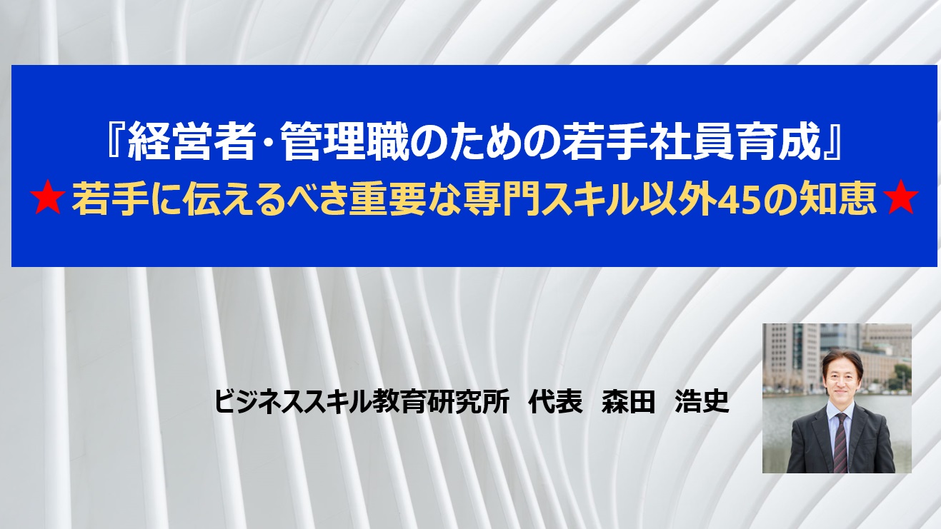 このような状況の中、まずは、管理職の方や若手上司の方々自身に、若手教育(育成)の重要性を再認識していただき、日ごろから若手に伝えるべきことをしっかりと考えて欲しいと思います。