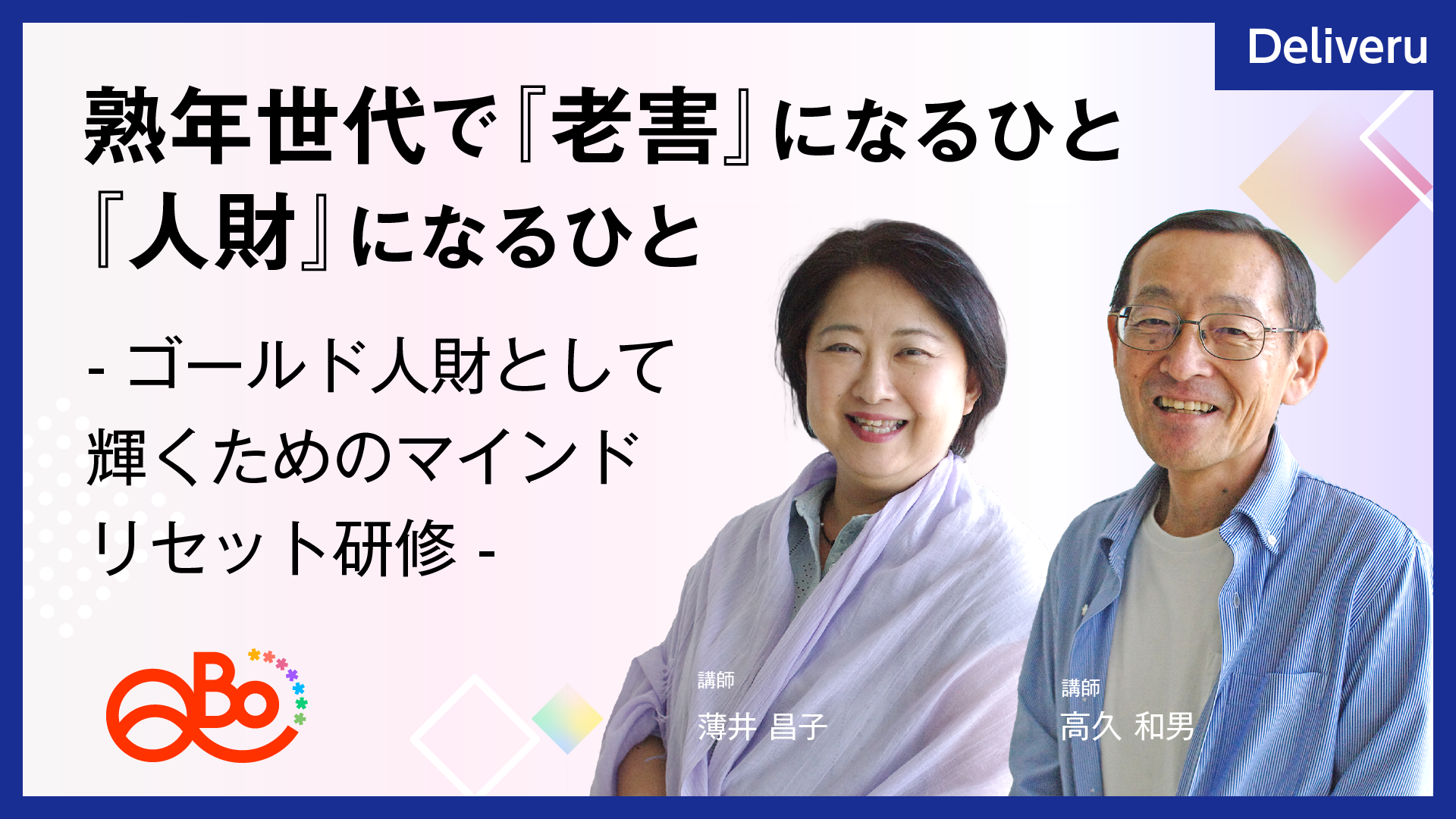 生涯現役という言葉がよく聞かれますが、役職定年、定年退職&継続雇用を経たあともイキイキと働いているひとにはどんな秘訣があるのでしょうか。 もし、「しかたなく働き続ける」「最低限をこなすだけ」といった受動的な働き方になれば、会社にぶらさがる「人罪(じんざい)」となり、周囲のモチベーションも下げる「老害」になる危険性があると言えるでしょう。 特に、昭和の人生観を引きずって仕事を頑張ってきた今の50歳代後半世代には、これまでのマインドセットを断捨離することが必要です。また、令和時代に求められる人生観と仕事観に気づき、準備をはじめることにより、はじめて、自分自身にとっても幸せなキャリアへの一歩を踏み出せるのです。 このセミナーの講師はいずれも入社以来同じ会社一筋で働き、定年退職後は継続再雇用を続けながら、セカンドキャリアとしても働いています。その間、闘病生活や介護など、様々な経験を経ている講師だからこそ語れる、「ゴールド人財」になるためのマインドセットについて学んでいただく機会とします。
