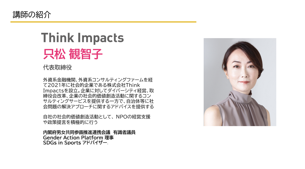 外資系金融機関、外資系コンサルティングファームを経て2021年に社会的企業である株式会社Think Impactsを設立。企業に対してダイバーシティ経営、取締役会改革、企業の社会的価値創造活動に関するコンサルティングサービスを提供する一方で、自治体等に社会問題の解決アプローチに関するアドバイスを提供する