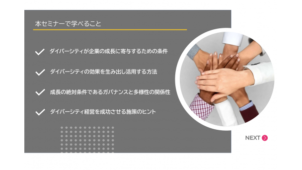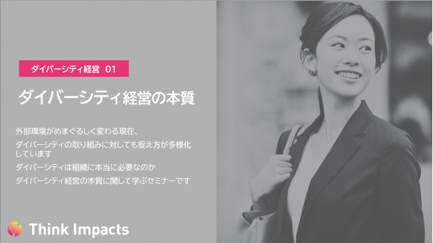 企業価値の向上につながるダイバーシティとは何か、なぜ今こそダイバーシティを活用すべきなのか。ダイバーシティと企業価値との関係性を学び、ダイバーシティ経営の本質を学べるセミナーです。