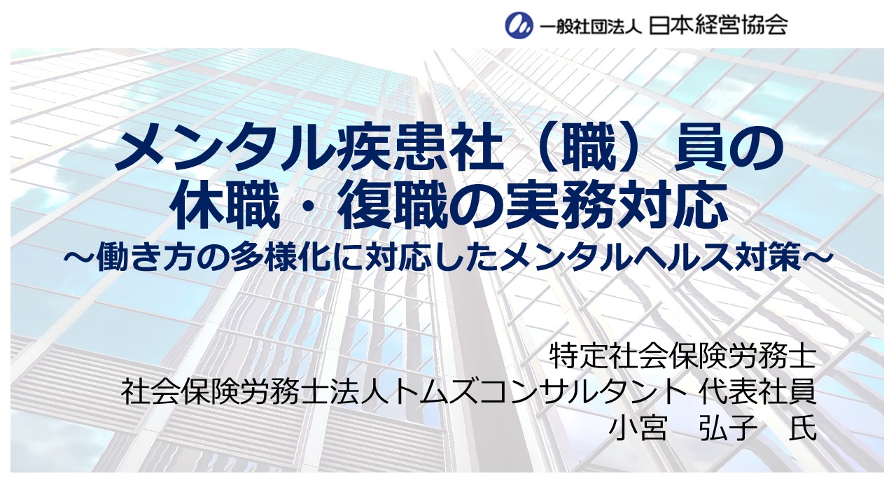 本セミナーでは、メンタルヘルスに関する基礎知識、休・復職制度の就業規則への定め方、初期段階から職場復帰の実務対応、留意点等について実例を交えながらわかりやすく解説いたします。
