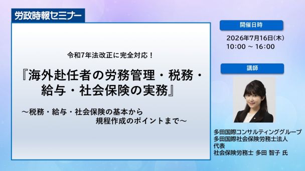 海外進出が活発化する中、担当者は海外赴任者の労務管理、給与、税務、社会保険の実務を取り扱う機会が増えてきます。 海外という慣れない環境では赴任者本人だけでなく、家族にとっても、さまざまな制約やリスク、トラブルが想定されます。税務では居住者・非居住者の区別や租税条約などを理解しておく必要があり、社会保険では被保険者資格の有無の違いや社会保障協定を押さえておくことが重要です。本講座では、海外赴任者の労務管理や税務、社会保険制度の基本を理解した上で、赴任者やその家族をサポートできるよう、対応のポイントと留意点を解説します。