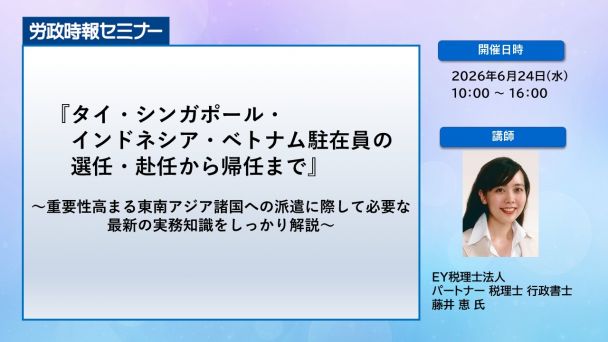 そこで本講座では、タイ・シンガポール・インドネシア・ベトナムの各国への赴任から帰任までに必要な社会保険・税務・給与・福利厚生などの手続き、そして健康管理やリスク管理、住居や子女教育などの実務について具体的に解説します。