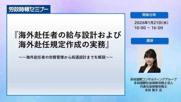 海外赴任者の処遇は、法律に定められたものはなく、あくまでも自社での制度設計となるために、その内容は各社さまざまです。しかしながら、社内においては、海外赴任給与や処遇ノウハウが少なく、外部においてもこれらに関する情報が十分でないため、どのように制度を設計していくべきか悩む担当者は少なくありません。本講座では、給与・処遇設計および赴任規程の作成について解説します。
