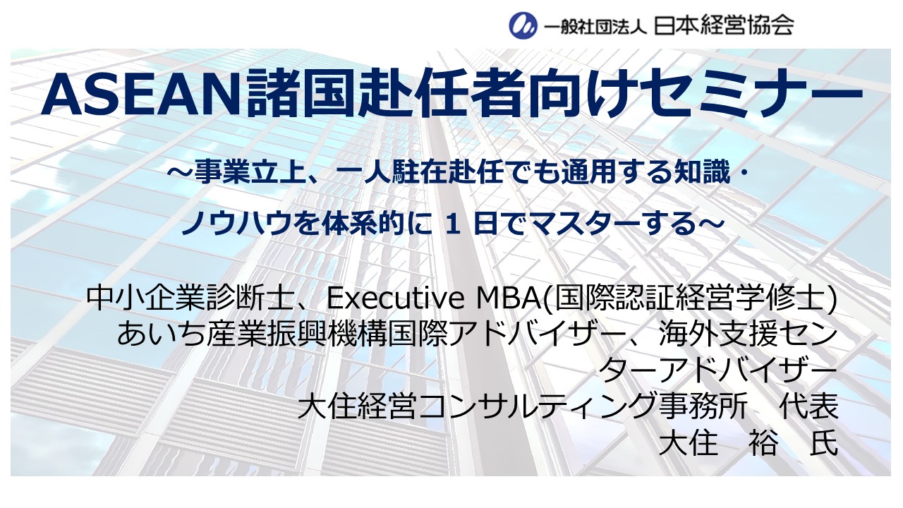 本講座では、海外事業の企画・立上・運営・改善に豊富な経験を持つ専門講師が、教科書的な赴任研修だけでは得られない、現地で即活用できる実践的な知識・ノウハウを体系的にわかりやすく解説します。さらに、一人駐在や少人数の事業立上げでも、現地で自律的に行動し成果につなげていくための思考法・視点を1日でしっかり身につけていただきます。