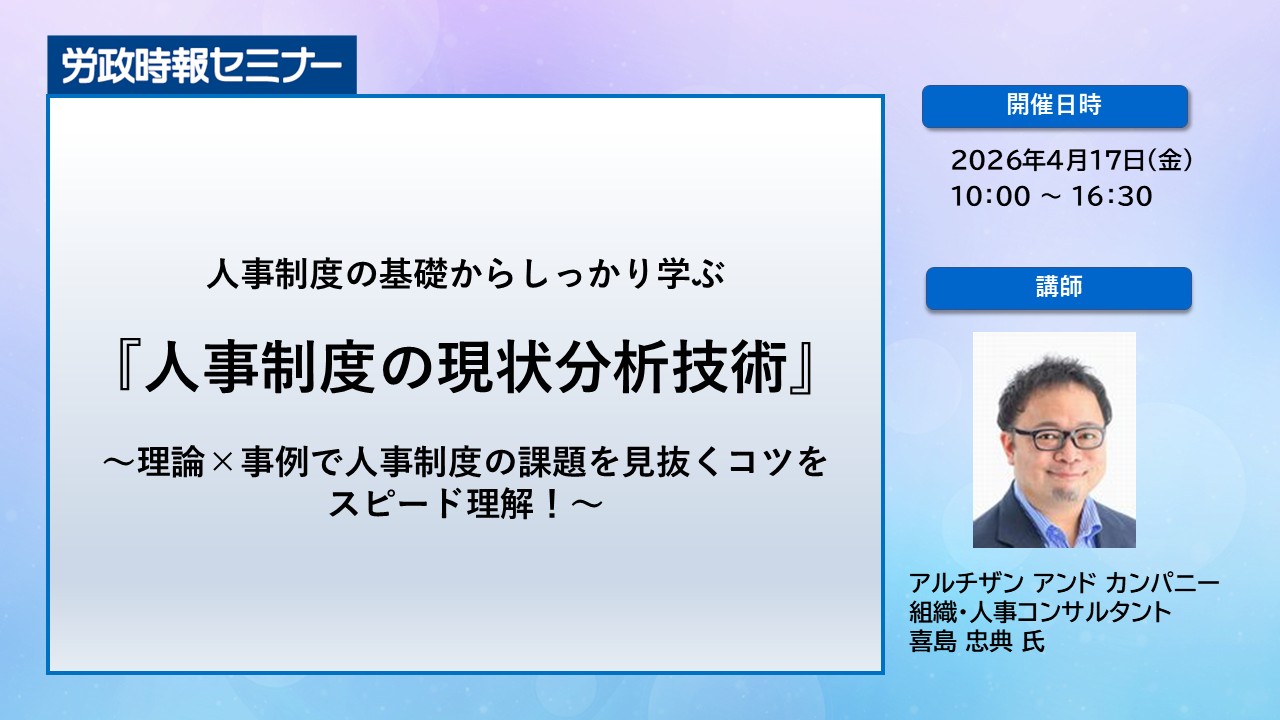 本講座は、自社の人事制度の分析・課題抽出するための知識・スキルを学びます。これまでも「頭が整理される」「実践的」とご好評頂いていますが、最新の課題・トレンドを織り込みバージョンアップした内容でお届けします。講座は特定の主義には偏らず、「最適な人事制度のあり方は各社によって異なる」という立場から、フラットな分析を行う目を養います。制度企画・運用の実務家の方から、人事戦略を統括する方まで幅広く役立つ内容です。