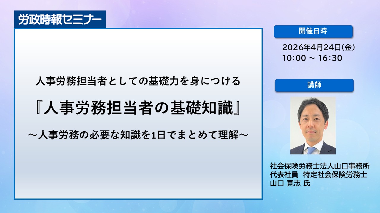 人事労務担当者は、人事制度や労働法令、社会保険、給与計算等の幅広い知識が求められ、明確な答えのないヒトの問題についても、バランス感覚をもって対応することが期待されています。本講座では、担当者として押さえておきたい人事労務に関連する法律や人事制度の仕組みを解説するほか、就業規則の運用や労務問題への対応など実務的なテーマを取り上げます。1日で人事労務の全体像がつかめるため、人事労務の初任者やあらためて知識を整理したい方にお勧めです。ぜひご参加ください。