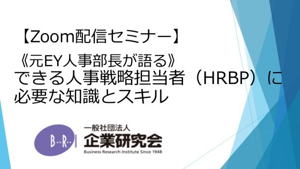 【開催にあたって】 昨今は多くの企業でHRBP(ヒューマンリソース・ビジネスパートナー)が活躍しています。その役割は非常に重要で、事業戦略の推進を支援すると同時に社員のエンゲージメントやモチベーション向上に寄与しています。ただ、期待役割を果たすうえで必要な知識・スキルは広範囲に及び、悩めるHRBPの方々おおいのではないでしょうか。世間には高額なHRBP養成講座もあるようです。 本セミナーはHRBPとして活躍されている、もしくは将来アサインの可能性がある方々に、カバーしなければならない知識・スキルをコンパクトに解説するものです。これにより自身のHRBPとしての現状を再認識し、さらなる学習・経験につなげていただけたら幸甚です。