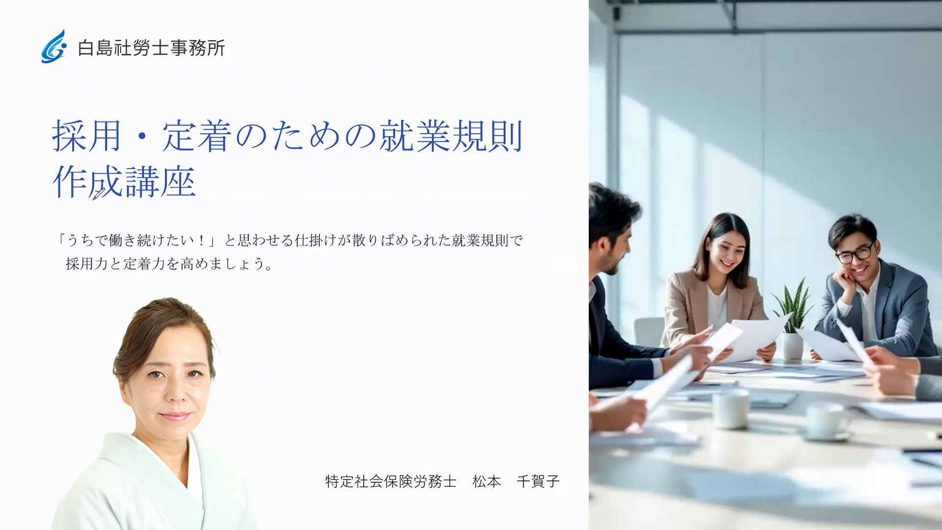 「採用・定着のための就業規則作成講座」は、法令を守るだけの就業規則ではなく、採用活動でのミスマッチを防ぎ、社員の定着率を向上させることを目的とした実践的な内容です。