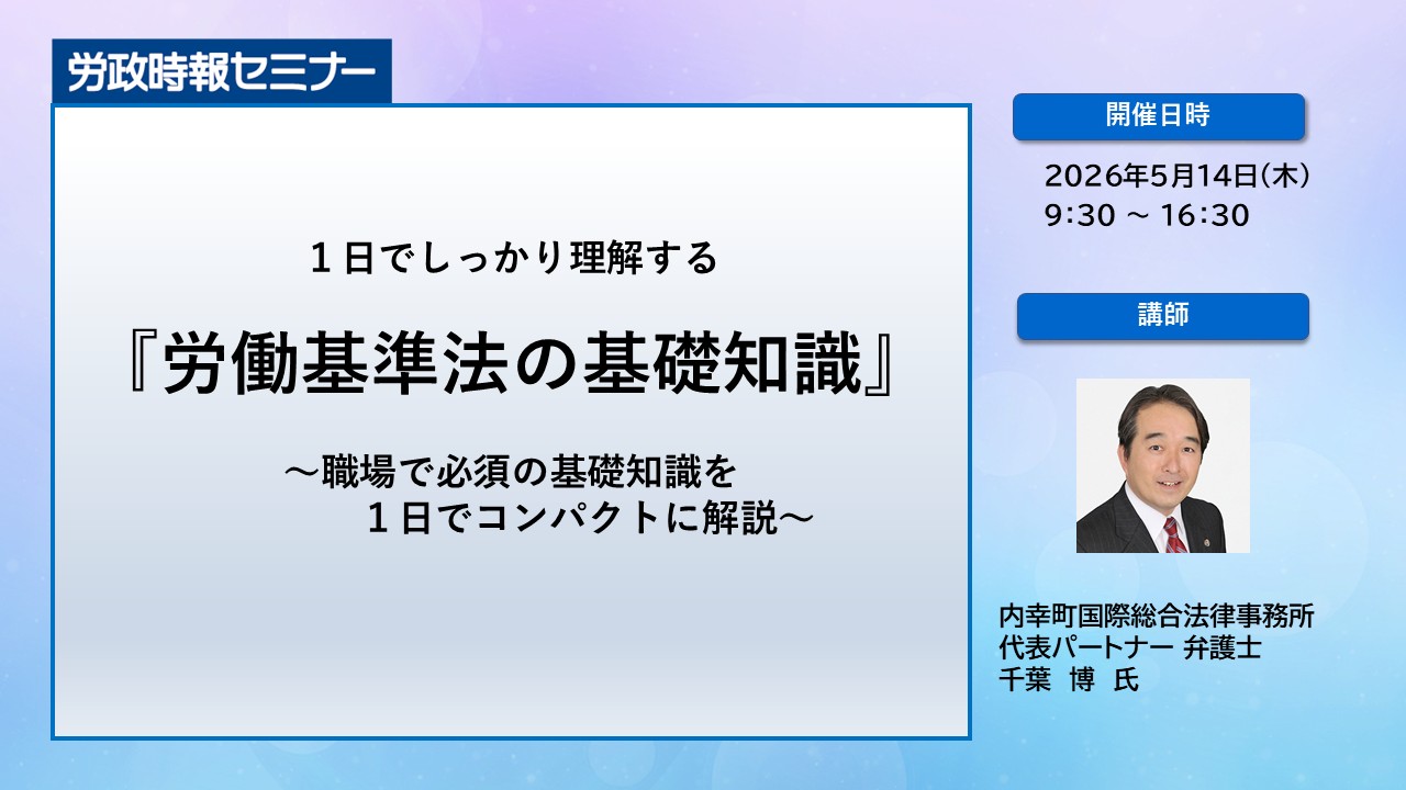 今回は、採用・入社から退職まで労働者や人事労務担当者・現場管理職にそれぞれの場面で必要となる条文・通達・判例等について解説します。1日で労働基準法の基礎をしっかり理解できるお勧めの講座です。ぜひご参加ください。
