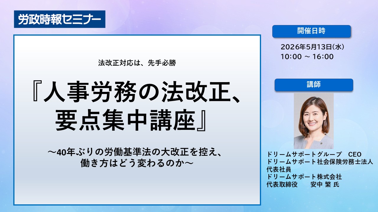 本講座では、これまでの重要な法改正の内容をあらためて整理・確認した上で、今後予定されている労働基準法大改正の全体像と、企業実務に大きな影響を及ぼすポイントについて解説します。最新の法改正の動向を正しく理解することは、企業のコンプライアンス強化のみならず、将来を見据えた人事労務戦略の構築にも直結します。