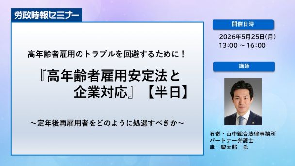本講座では、改正高年齢者雇用安定法の内容を踏まえ、定年後再雇用者の雇止め、待遇格差をめぐる問題など現場で起こっている諸問題と対応策、高年齢者雇用の留意点についてわかやすく解説します。