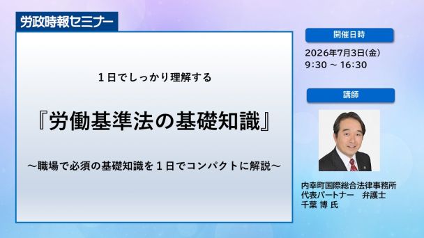 今回は、採用・入社から退職まで労働者や人事労務担当者・現場管理職にそれぞれの場面で必要となる条文・通達・判例等について解説します。1日で労働基準法の基礎をしっかり理解できるお勧めの講座です。ぜひご参加ください。