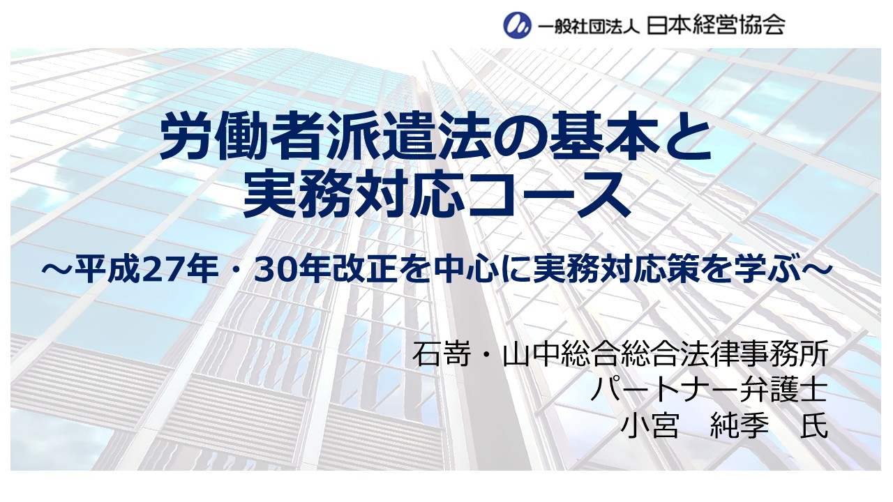 本講座では、平成27年及び平成30年派遣法改正を中心に、労働者派遣法の理解を深めるとともに、派遣元・派遣先双方が適切な運用ができるよう実務対応策について解説・指導致します。