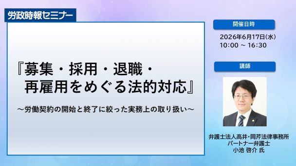 本講座では、そのような注意が必要なフェーズでの基本的知識を法令・判例の面から確認するとともに、典型的なトラブル事案における実践的な解決例をわかりやすく解説します。フェーズごとに多角的な視点から確認することにより、人事担当者の知識の定着を図り、将来発生するかもしれないトラブルに対処する準備に万全を期すことを目的としています。 ぜひ、ご参加ください。