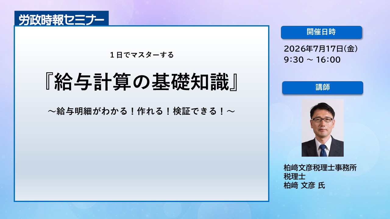 給与計算で一番大事なことは、間違いのない計算をすることです。給与ソフトに入力するすべての項目が理解できていますか?理解できていないなら、いつ間違いが起きても不思議ではありません。本講座は、間違いのない給与計算を行うために、給与計算に必要な知識をわかりやすく解説し、演習問題を通じて実践力を養成します。給与計算担当の新任者の方はもちろんのこと、給与計算に必要な知識を再整理したい方もぜひご参加ください。