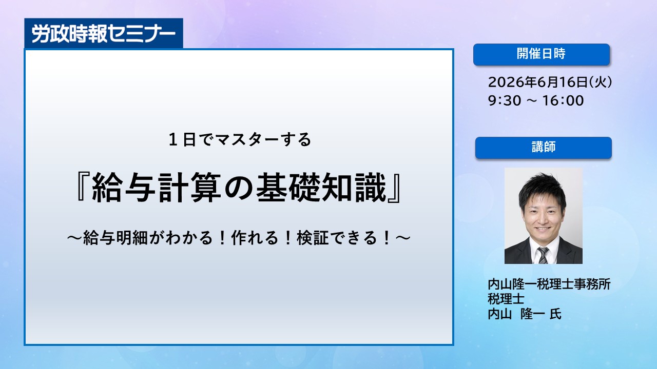 給与計算で一番大事なことは、間違いのない計算をすることです。給与ソフトに入力するすべての項目が理解できていますか?理解できていないなら、いつ間違いが起きても不思議ではありません。本講座は、間違いのない給与計算を行うために、給与計算に必要な知識をわかりやすく解説し、演習問題を通じて実践力を養成します。給与計算担当の新任者の方はもちろんのこと、給与計算に必要な知識を再整理したい方もぜひご参加ください。