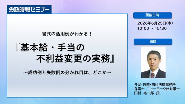 本講座では、労働条件の不利益変更の中でも、基本給・手当(退職金は含まず)に絞り、実務面での(就業規則の不利益変更と個別同意取得を中心とした)具体的な対応方法につき、書式を用いて、わかりやすく解説します。