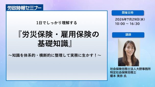 労災保険と雇用保険は"労働保険"と呼ばれ、労働関係諸法令の中でもとりわけ重要な制度として、人事労務担当者はその制度概要を押さえておく必要があります。本講座では体系的・実務的な知識習得を目指して、両制度の目的や全体像といった基礎知識から、他法との関係や具体的な実務上のポイント等について、横断整理やケーススタディを交えながら、わかりやすく解説します。