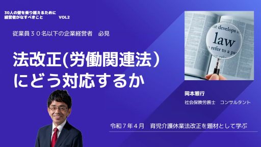 従業員30名以下の企業経営者 必見 法改正(労働関連法)にどう対応するか ~令和7年4月 育児介護休業法改正を題材として学ぶ~ 30人の壁を乗り越えるために経営者がなすべきこと vol.2