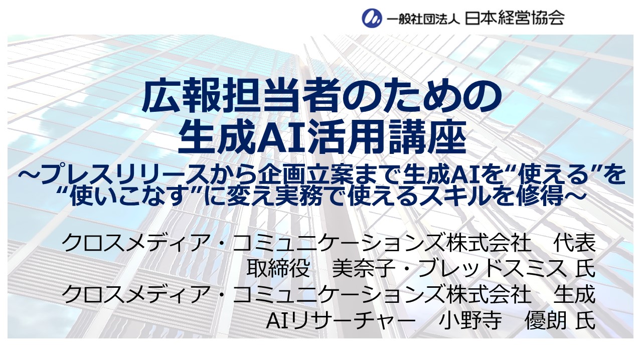 本セミナーでは広報担当者の皆様を対象に、生成AIの基礎から実務での応用までを体系的に学びます。プレスリリース作成、競合分析、企画立案など広報業務の具体的な場面を通して、AIを“使える力”に変える実践的なスキル習得を目指します。