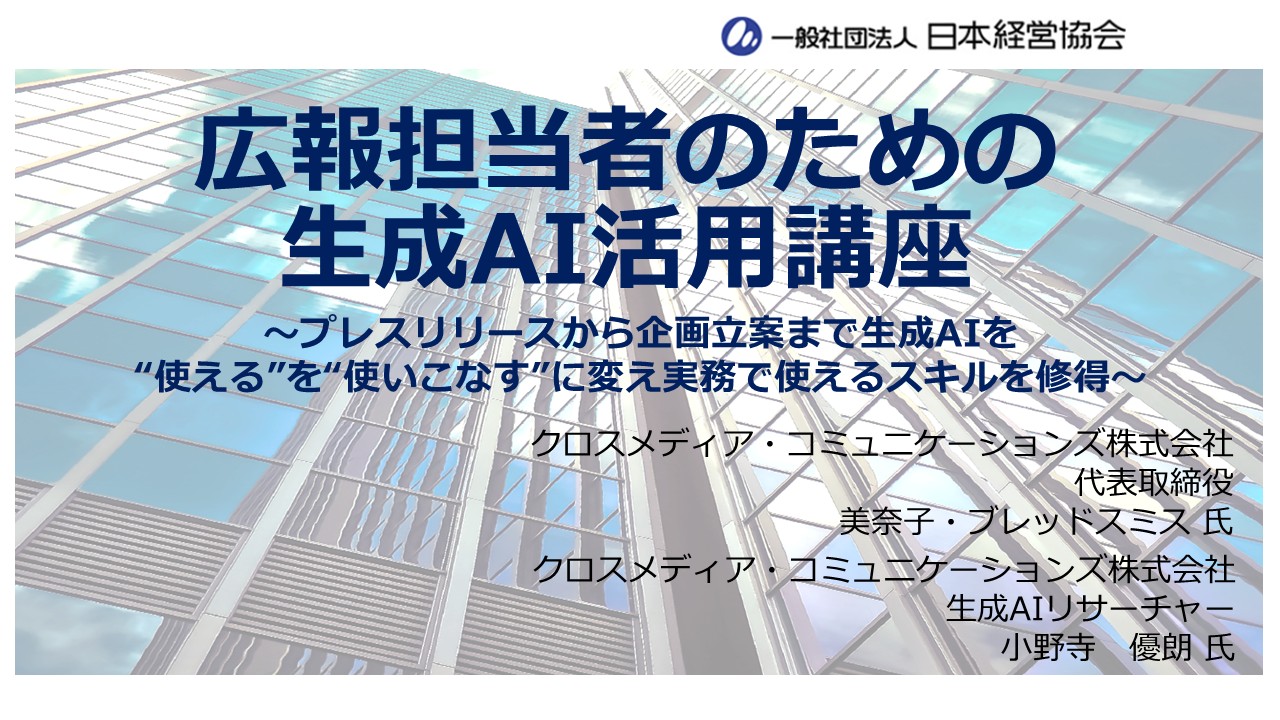本セミナーでは広報担当者の皆様を対象に、生成AIの基礎から実務での応用までを体系的に学びます。プレスリリース作成、競合分析、企画立案など広報業務の具体的な場面を通して、AIを“使える力”に変える実践的なスキル習得を目指します。