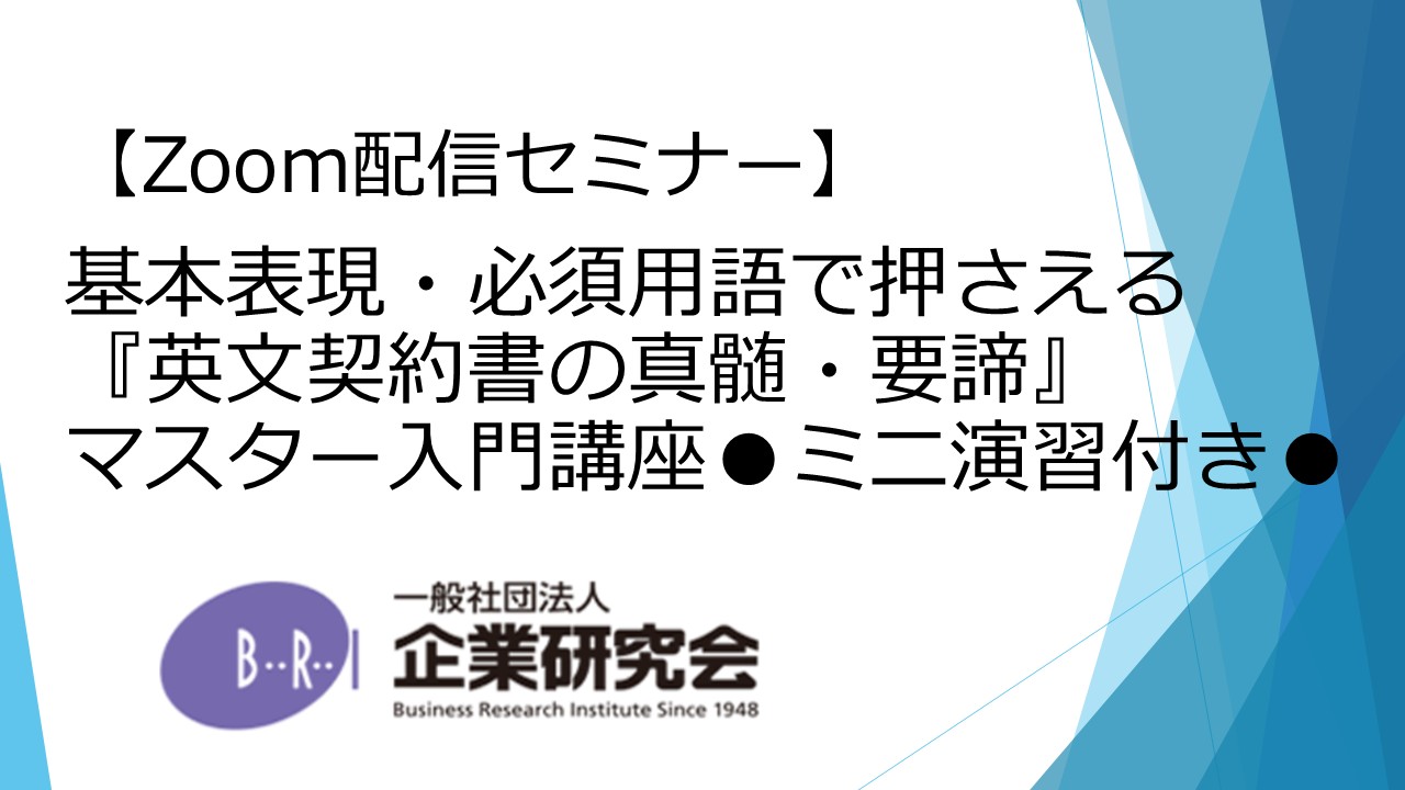 【開催にあたって】 本セミナーは、特に重要と思われる基本表現を交渉の対案としての活用を含めて解説していくセミナーです。 基本表現をマスターすることで英文契約書をマスターする講師開発のメソッドを活用します。初学者のご参加を強くお勧めします。特に初学者にとっての電子契約・電子署名時代の必須の対応とは一体何?生成A I時代の理想的な契約審査業務のあり方は?など新たな課題へのあるべき対応も示します。 【ご受講者様には特典として『英文契約書の基本表現』(日本加除出版)を、セミナー後に送付致します。】