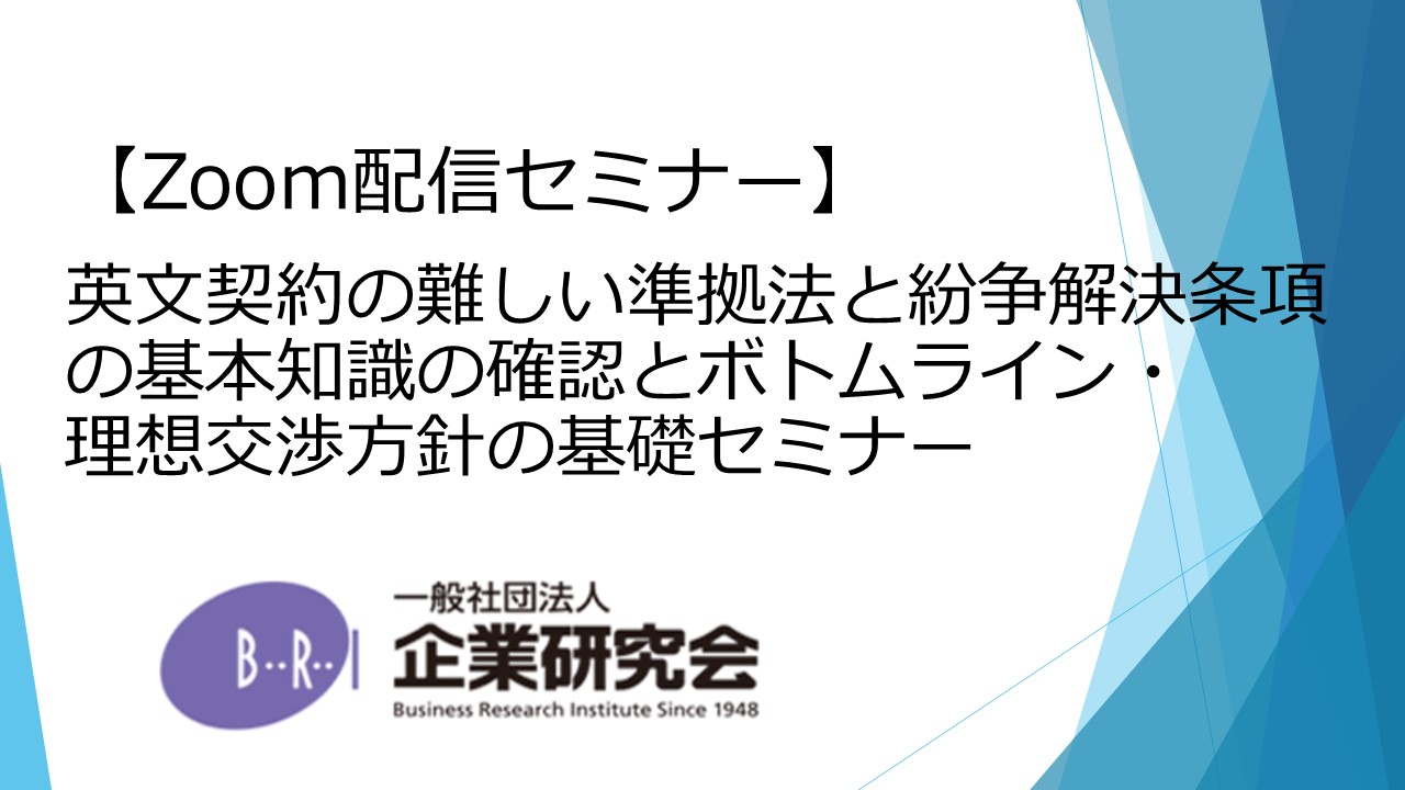 【開催にあたって】 国際契約(英文契約)の交渉で必ず最後まで懸案条項として残ることが多い「準拠法と紛争解決(裁判管轄、仲裁合意)条項」ですが、基本的な知識が不十分の中で、個別の事案で不安や心配の中で最終合意(妥協)をすることが多いのではないかと思います。 この講座では、準拠法と紛争解決(裁判管轄、仲裁合意)の各条項について、知っておくべき条文構成の建付けと、具体的な事例で演習(ケーススタディー)を実施しながら、契約交渉の実戦で役に立つ基礎知識を習得していただくことを目的とします。 あえて難しい条項に飛び込んで泳ぎ方の基本を学んで頂く趣旨の「初学者」の方はもちろん、「基本表現」講座を受講された方で「難しい条項」の基礎を詳しく学びたい方、ベテランの方の基本の確認、管理者の方の契約交渉管理ポイント、法務・契約のご担当者のみならず、広く英文契約交渉に携わる方に有益な基礎知識をご提供いたします。