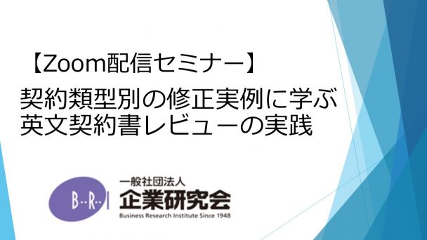 【開催にあたって】 英文契約書の実務においては、交渉の経緯や相手方との力関係等により、相手方作成の契約書案をベースに交渉せざる得ないケースが珍しくありません。 このようなケースにおいては、相手方作成の契約書案に隠された様々な問題点を的確に見抜いた上で、最小限の修正でそれを解消する技術が求められ、自社で契約書案を作成するケースとは異なった難しさがあります。 そこで、本セミナーでは、英文契約書の実務に携わる方がこのようなケースへの対応力を向上させるため、講師が最近相談を受けた数十件の英文契約書から抽出した修正前・修正後の条項例(ただし社名等は変更)を用いて、 契約類型別のレビューのポイントを解説します。 なお、本セミナーは、英文契約書の基礎知識をお持ちの方を主に想定しており、実戦的なノウハウの解説にフォーカスします。