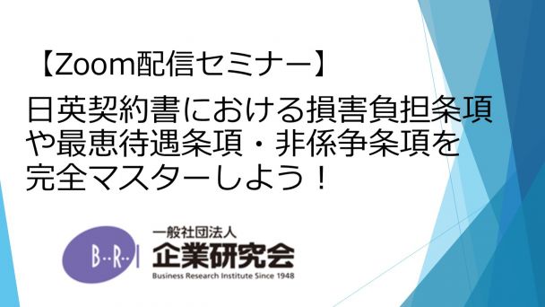 【開催にあたって】  英文契約の交渉で必ず最後まで懸案条項として残ることが多い損害負担条項である「保証・免責補償・損害賠償の制限」の各条項ですが、基本的な知識が不十分の中で、個別の事案で不安や心配の中で最終合意(妥協)をすることが多いのではないかと思います。また、アメリカ大手企業から提示されることが多い、最恵待遇条項・非係争条項に対しても同様に基本的な知識が不十分の中で、個別の事案で不安や心配の中で最終合意(妥協)をすることが多いのではないかと思います。  この講座では、ソフトウェアのライセンス契約や商品の売買契約を中心に、保証・免責補償・損害賠償の制限、最恵待遇条項・非係争条項の各条項について、知っておくべき条文構成の建付けや抑えるべきポイントをご説明した上で、簡単な事例でミニ演習(ケーススタディー)を実施しながら、契約交渉の場面で実際に役立つ基礎知識を習得していただくことを目的とします。  あえて難しい条項に飛び込んで泳ぎ方の基本を学んで頂く趣旨の「初学者」の方はもちろん、「基本表現」講座を受講された方で「難しい条項」の基礎をじっくり学びたい方、ベテランの方の基本の確認、管理者の方の契約交渉管理ポイント、法務・契約のご担当者のみならず、広く英文契約交渉に携わる方に有益な基礎知識をご提供いたします。