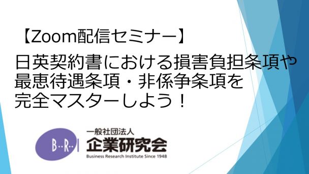 【開催にあたって】 英文契約の交渉で必ず最後まで懸案条項として残ることが多い損害負担条項である「保証・免責補償・損害賠償の制限」の各条項ですが、基本的な知識が不十分の中で、個別の事案で不安や心配の中で最終合意(妥協)をすることが多いのではないかと思います。また、アメリカ大手企業から提示されることが多い、最恵待遇条項・非係争条項に対しても同様に基本的な知識が不十分の中で、個別の事案で不安や心配の中で最終合意(妥協)をすることが多いのではないかと思います。 この講座では、ソフトウェアのライセンス契約や商品の売買契約を中心に、保証・免責補償・損害賠償の制限、最恵待遇条項・非係争条項の各条項について、知っておくべき条文構成の建付けや抑えるべきポイントをご説明した上で、簡単な事例でミニ演習(ケーススタディー)を実施しながら、契約交渉の場面で実際に役立つ基礎知識を習得していただくことを目的とします。 あえて難しい条項に飛び込んで泳ぎ方の基本を学んで頂く趣旨の「初学者」の方はもちろん、「基本表現」講座を受講された方で「難しい条項」の基礎をじっくり学びたい方、ベテランの方の基本の確認、管理者の方の契約交渉管理ポイント、法務・契約のご担当者のみならず、広く英文契約交渉に携わる方に有益な基礎知識をご提供いたします。