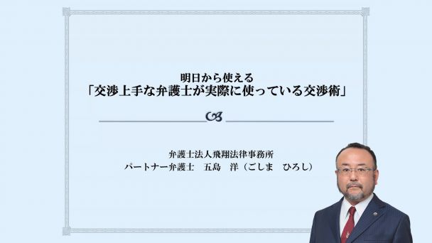 弁護士として実際に用いている各種交渉術について、ビジネスシーンで使いやすい交渉術・大技や小技といった技術的な交渉術・クレーム処理等に適した交渉術・特殊な交渉術等のジャンルに分けて解説します。各交渉術を分解して構造を明らかにするとともに、どこに気を付ければ上手くいくのかを説明することで、明日から使えるノウハウを身に付けて頂くものです。さらには、交渉術を契約書等に応用した方法まで説明します。
