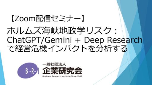 【開催にあたって】 本セミナーでは、ホルムズ海峡封鎖という重大な地政学リスクを題材に、ChatGPT + Deep ResearchによるOSINT(オープンソース・インテリジェンス。海外英文資料を主対象として行う深掘り分析)を駆使した経営インパクト分析の手法を詳説する 。ChatGPTやGeminiの「Deep Research」機能を最大化させる構造化プロンプトを用い、主要10業界におけるサプライチェーンの断絶やコスト増、財務リスクを可視化する具体的なケーススタディを提示する。これにより外部のシンクタンクやコンサルティング会社に依頼せずとも、社内の担当部門だけで高度なリスク分析、対策立案などができるようになる。