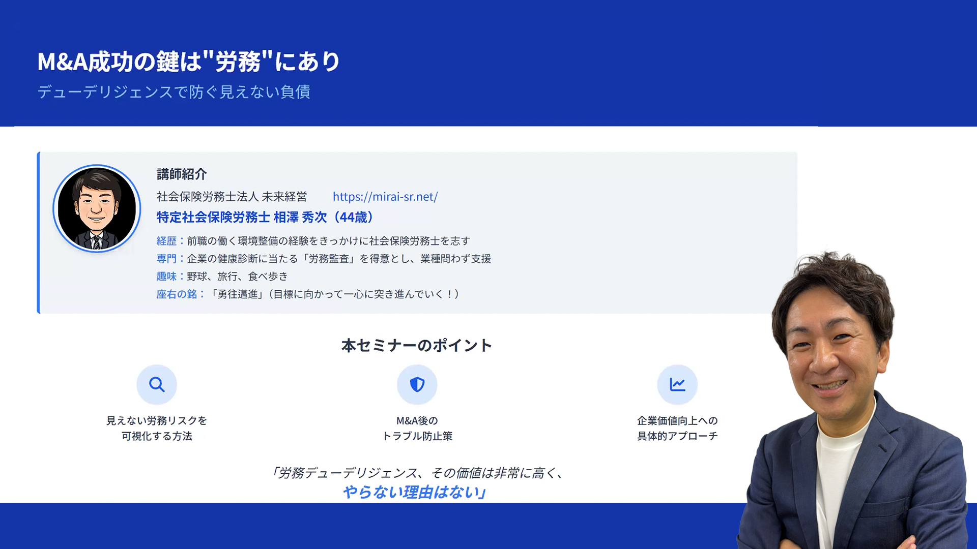 本セミナーでは、未来経営独自の「みらい式 労務デューデリジェンス5ステップ」を通じて、